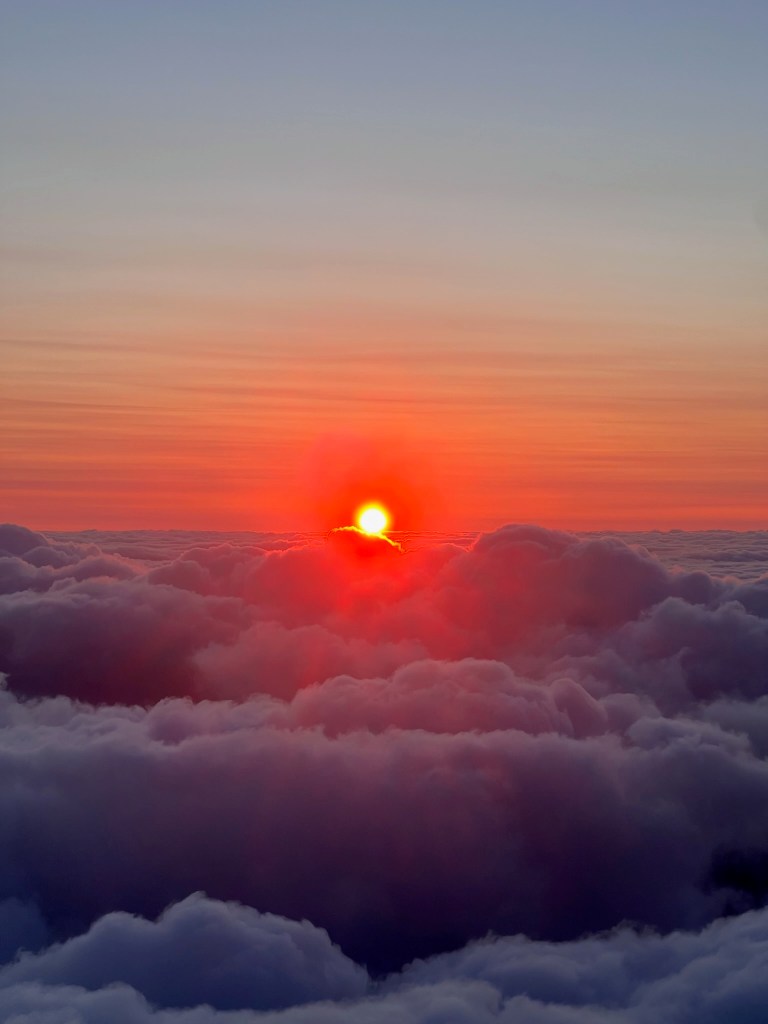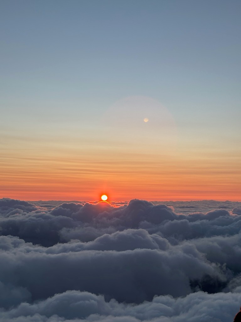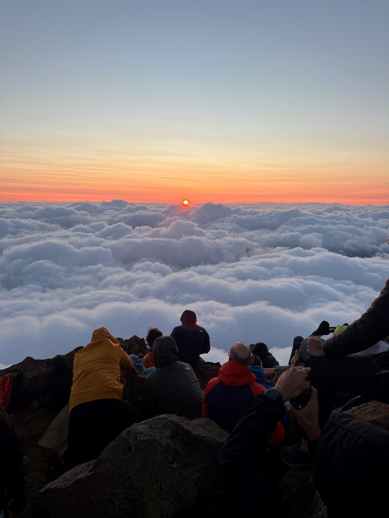 After this tough last part of the hike we reached the summit of 2351 meters around 5:30 AM. 4 hours of intense hiking made me quite sleepy on the peak but the adrenaline & the cold keeps you awake. Luckily there are some hot spots on the summit as the volcano is releasing hot air and you can warm up a bit. We were the first group to reach the summit, while we were waiting 1 hour for the sunrise, more groups arrived so that we were around 30 people on the peak. While you are waiting for the sun to make its appearance you will be amazed by the amount of stars you are able to see on the clear sky as you are above the clouds. We even spotted the milky way, shooting stars and different star constellations such as the Big Dipper („Großer Wagen“ in German), so basically every wish that could become true on a nocturnal hike. Last but not least, the sunrise above the clouds was one of the most beautiful experiences I will cherish forever.