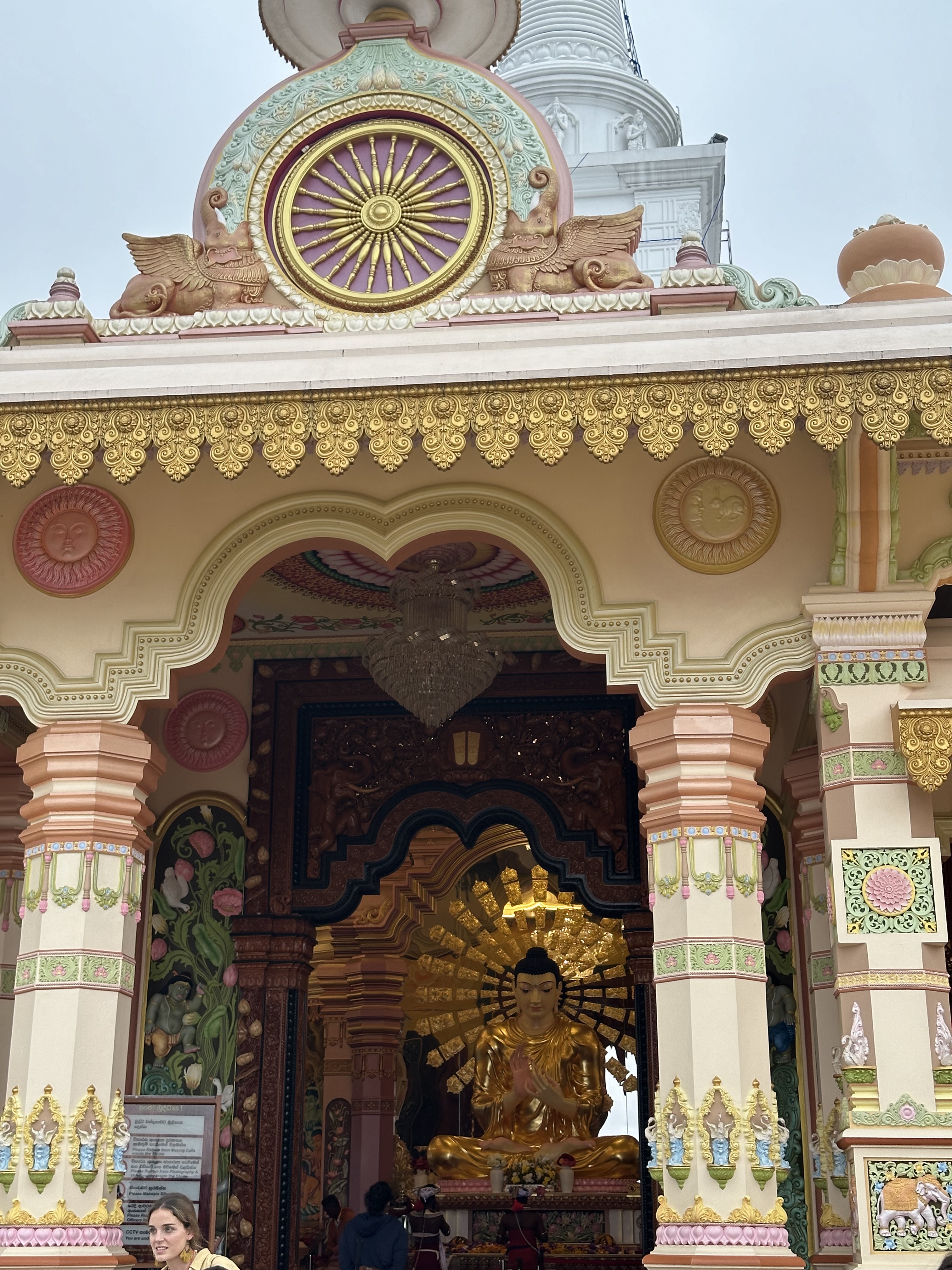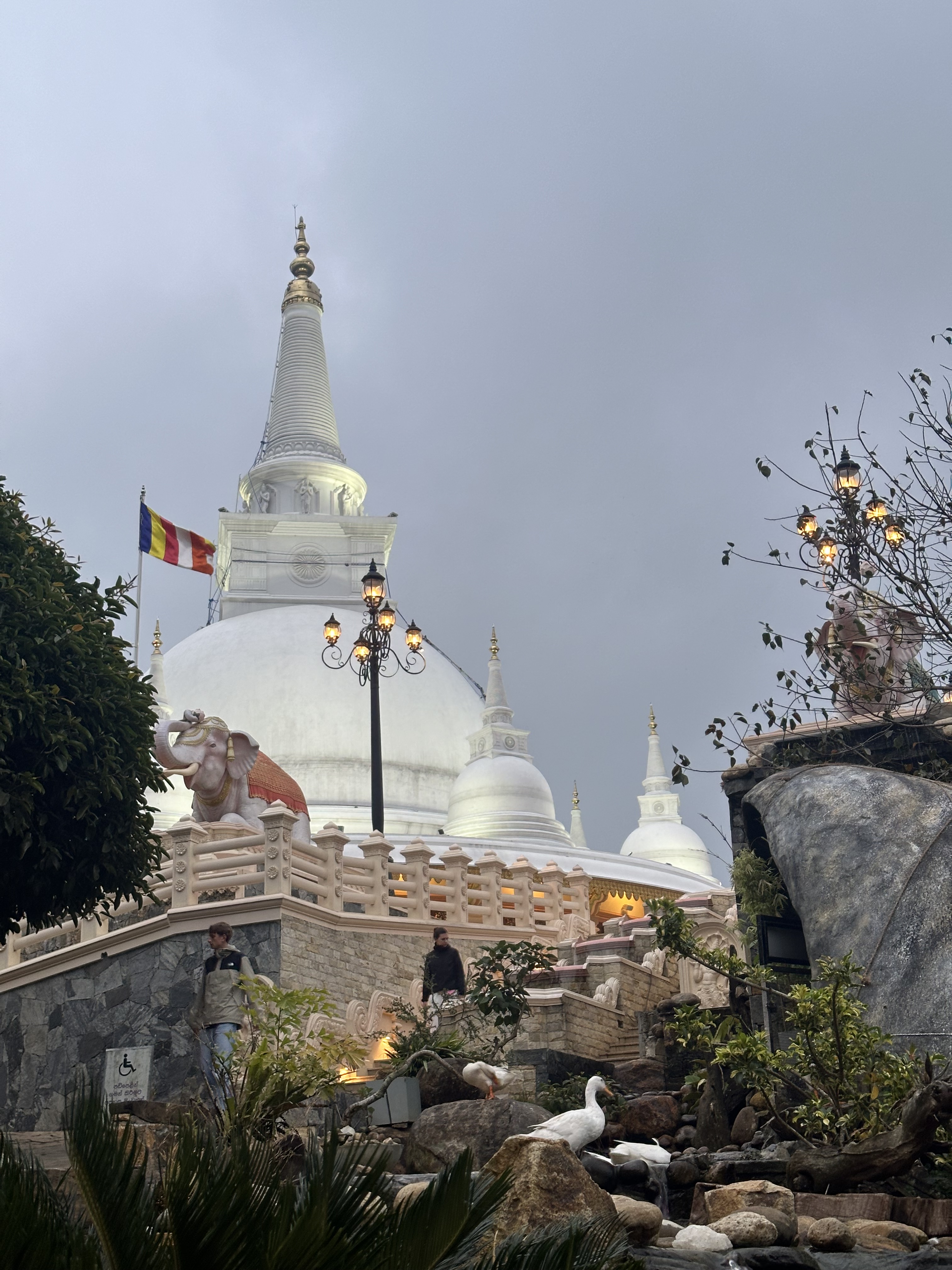 First of all, the temple itself is absolutely stunning and easily one of the most beautiful temples we visited in Sri Lanka—if not in all of Southeast Asia. The architecture is very elegant and peaceful, with bright white buildings, golden details, and carefully designed gardens surrounding the temple grounds. Everything feels incredibly calm and harmonious, especially with the temple sitting high in the hills around Ella.